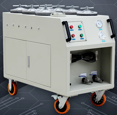 該濾油機通常由立油泵、真空表、壓力表及多個過濾濾筒并聯(lián)組成,吸油口粗過濾器保護油泵并延長主過濾器使用壽命。它能夠連續(xù)不斷地進行油液凈化,將油液中的污染顆粒和水分去除,過濾精度可達NAS1638-3級。